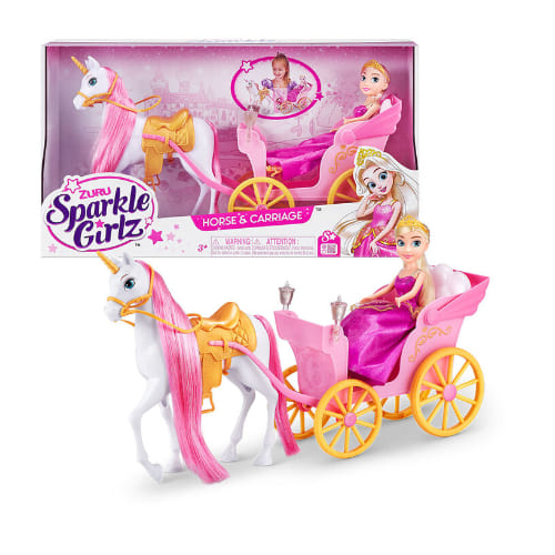 This enchanting set features a royal carriage detachable from a majestic unicorn, allowing the Sparkle Girlz princess to travel across her magical kingdom in style.